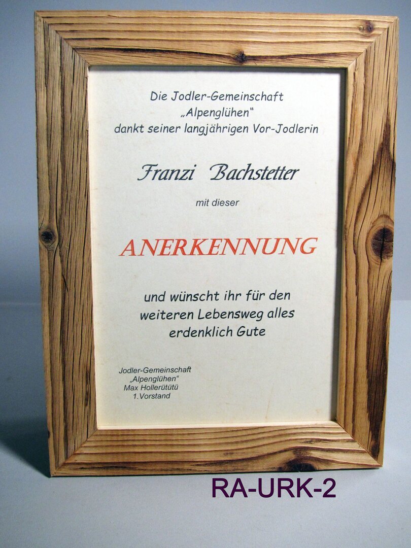 Vereine ehren damit ihre verdienten Mitglieder, Firmen gratulieren mit ihr zur langjährigen Betriebszugehörigkeit und Ferienorte bedanken sich bei stets wiederkehrenden Urlaubern, selbst Kinder bekommen sie schon bei den Bundesjugendspielen - eine Urkunde.Und jedes Mal drückt man dem Jubilar ideenlos ein Stück Pappe in die Hand, welches zuhause dann sofort und auf "nimmer-wieder-sehen" in einer Schublade verschwindet.Aufgrund mehrerer Anfragen habe ich nun einen speziellen Urkunden-Rahmen aus heimischem Altholz in mein portfolio aufgenommen.Dieser Rahmen ist passgenau für Urkunden und andere Auszeichnungen für das DIN A4-Format (29,7 x 21 cm).Vorteil: Sollte dem Jubilar irgendwann die Urkunde missfallen, hat er immer noch einen wunderschönen Bilderrahmen, der sicherlich nicht auf dem Dachboden sein Dasein fristen muss !!DIN A-4 Rahmen „Tegelberg“Rahmenbreite: 4 cmfür Format A-4, 29,7 x 21 cm = 31,95 €Gewerbliche Kunden, Vereine oder Gemeindeverwaltungen fragen für größeren Stückzahlen die „B2B“-Preise an.Um Vorlage eines entspr. Nachweises wird gebeten.zuzügl. Versandkosten:Bitte wählen Sie die jeweilige Warengruppe im Bestellvorgang selbstWarengruppe 1 = 1 RahmenWarengruppe 2 = 2-3 RahmenWarengruppe 4 = Gratis-Versand ab 4 RahmenDamit auch Ihr ganz großer DIN A-3 Meisterbrief (29,7 x 42 cm, Standard-Größe der Handwerkskammern) in Ihren Geschäfts- oder Büroräumen so richtig zur Geltung kommt, fertige ich Ihnen nach Vorbestellung den passenden Altholz-Rahmen. Die Rahmenbreite beträgt 6 cm.Bitte rechnen Sie jedoch mit einer Lieferzeit von ca. 10 Tagen.Eine Anzahlung in Höhe von 50% ist obligatorisch.Rahmenbreite: 6 cmGesamtmaße: ca. 42 x 54 cmPreis: 76,95 € inklusive Versandkosten per HERMES